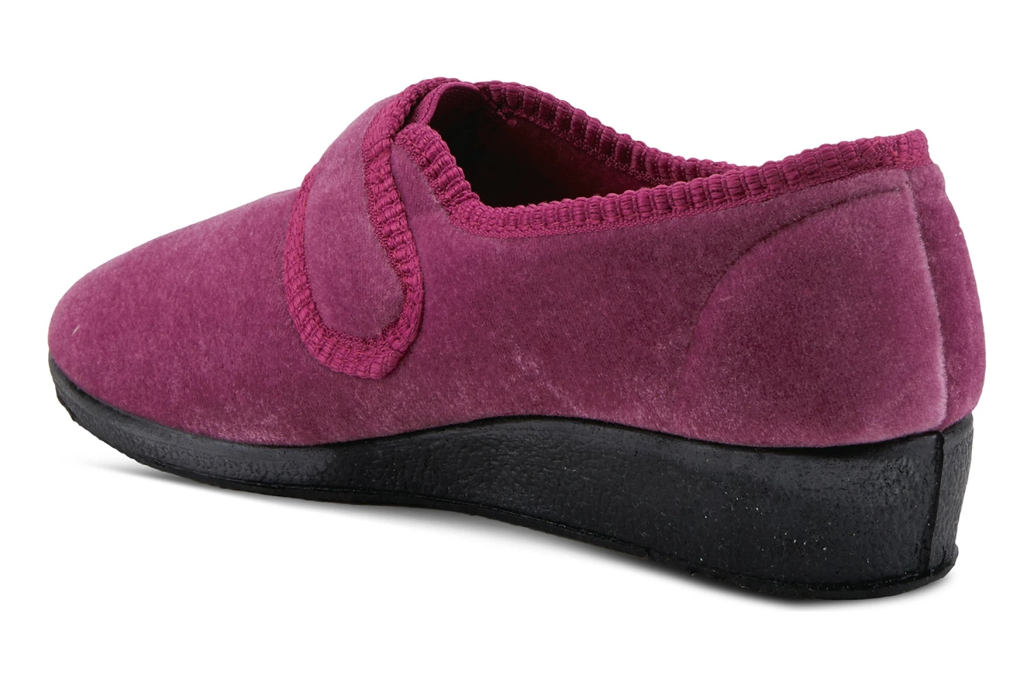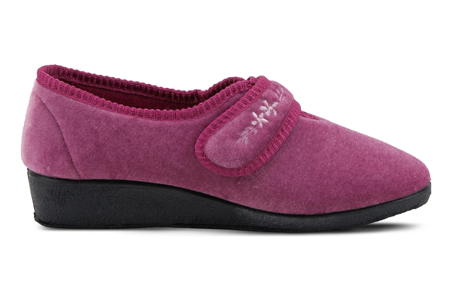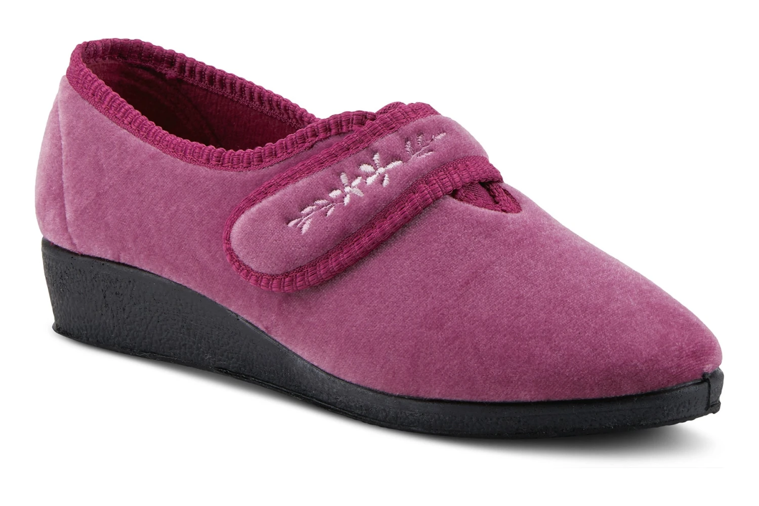 Easy to Slip-on velvet-like indoor/outdoor single strap slipper with embroidered floral detail and superb comfort cushioning for added comfort.