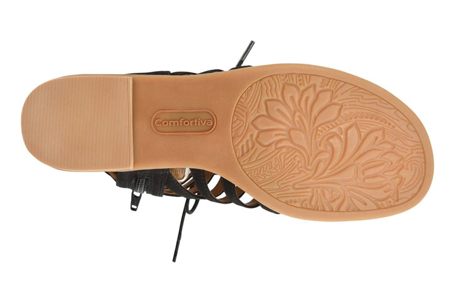 Dress up any outfit with the women’s Comfortiva Blossom sandal. The leather upper features an adjustable ghillie lace up and a side zip up closure for easy on and off. The padded footbed supports the foot from heel to toe, while the durable TPR outsole provides traction and stability. This warm weather sandal can easily be paired with any outfit, making it a wardrobe staple.