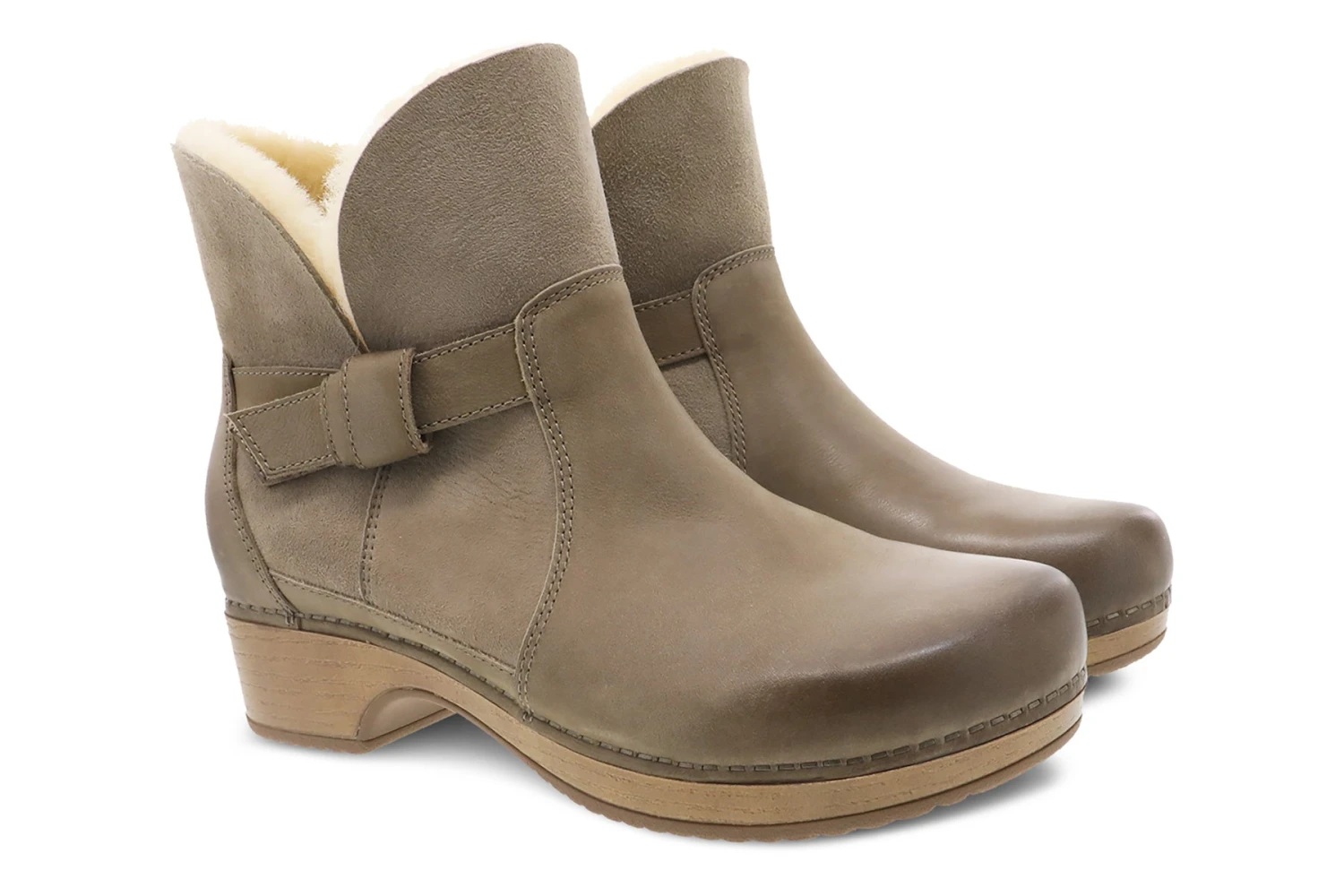 Bessie is a versatile, shearling-lined, low pull-on bootie that can be worn two ways. Worn with the top folded over, this boot showcases a cozy shearling detail. This casual, weekend-ready style features our patent-pending stapled construction, linings with Aegis Microbe Shield for odor control, leather uppers treated with 3M Scotchgard protector for stain resistance, and a lightweight patent-pending EVA outsole for long-lasting wear.