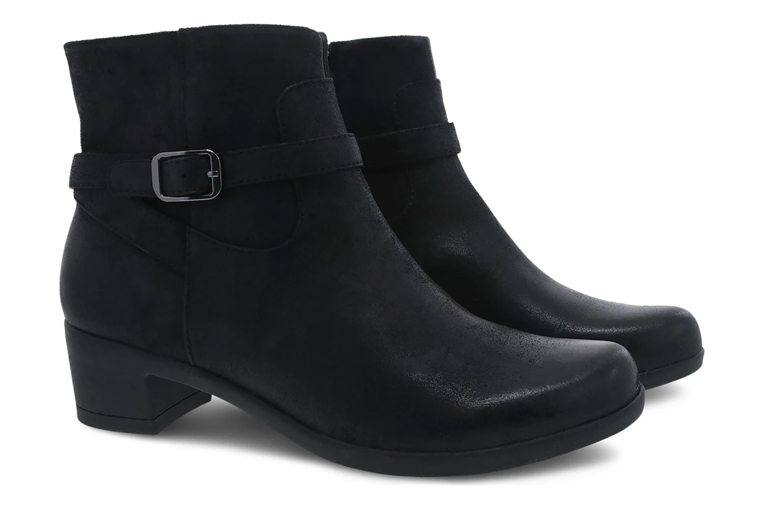 The Cagney is a heeled boot with a straight topline and a buckle strap, giving you a modern look. Perfect with a dress or a pair of skinny jeans, the Cagney features burnished suede uppers treated with 3M Scotchgard for stain resistance, leather uppers, lined with a combination of chrome-free and 100% recycled textile linings, a removable footbed with Dansko Natural Arch technology, and a rubber outsole for long-lasting wear.