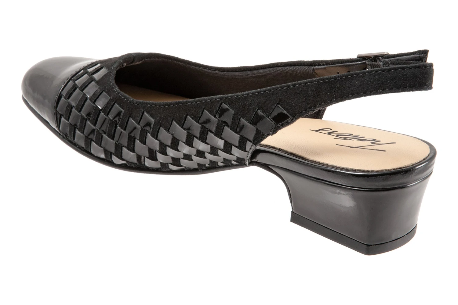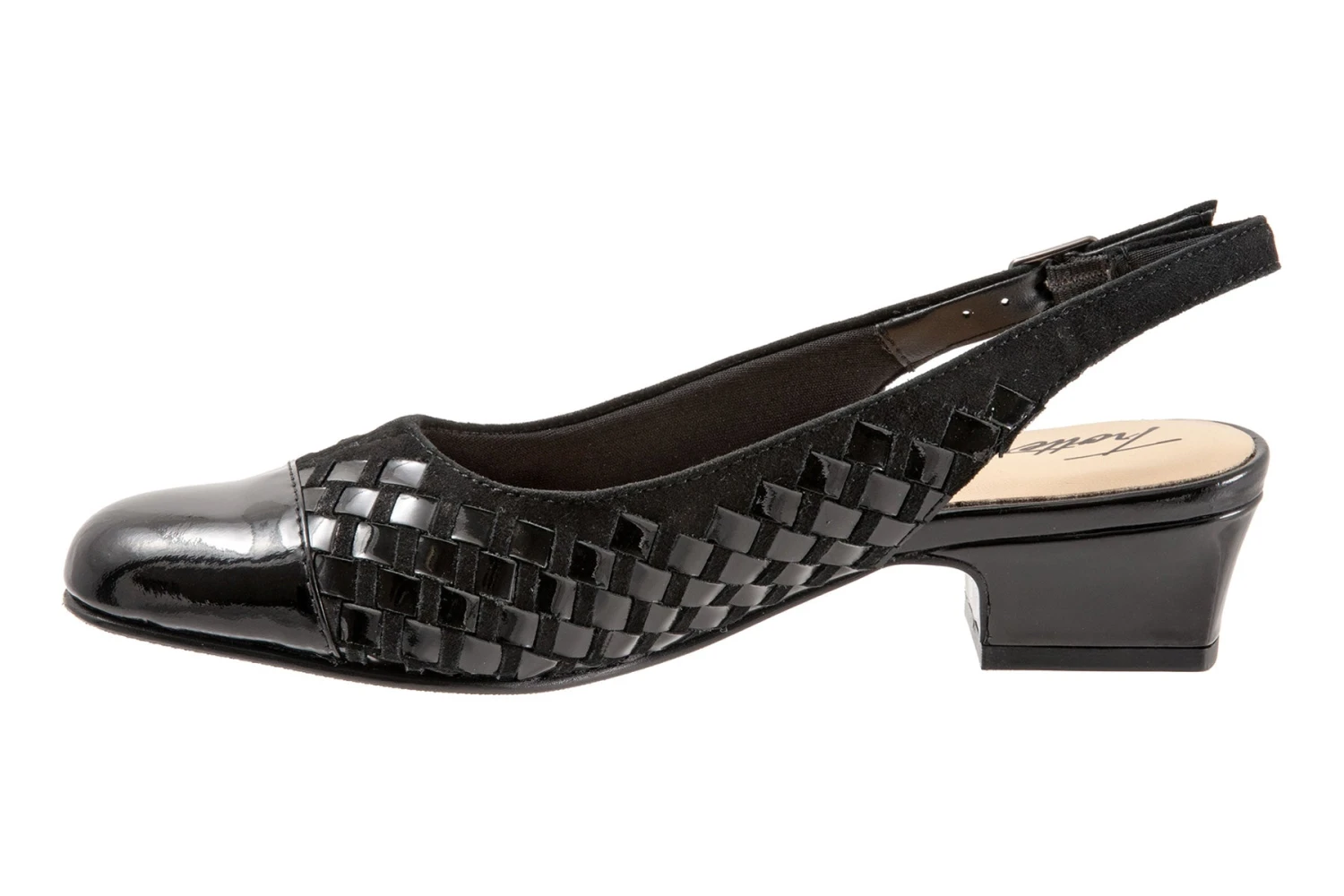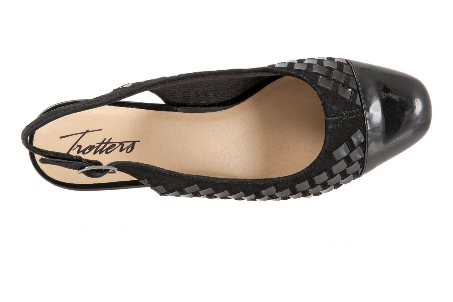 A cap toe adds classic character to a pump elevated by trend right woven detailing and a slender slingback strap.