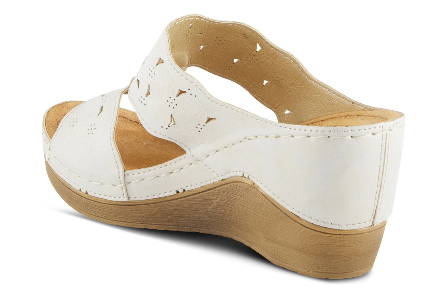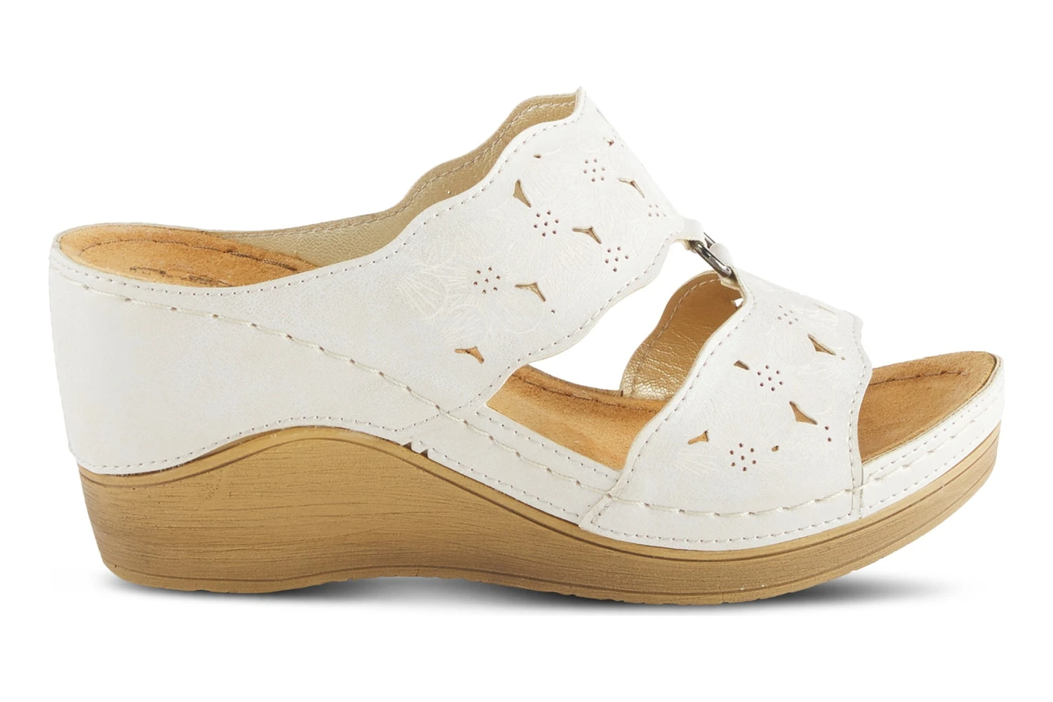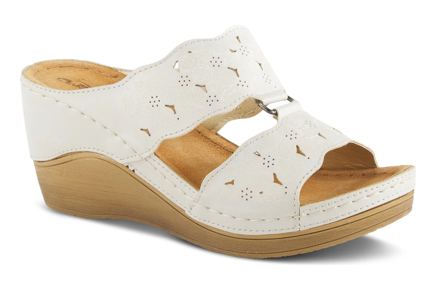 Double strapped wedge slide sandal with a connecting loop and geometric perforations
