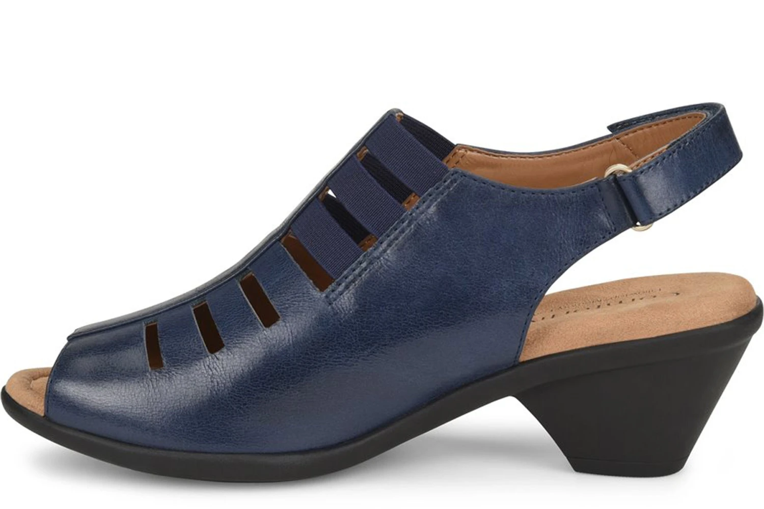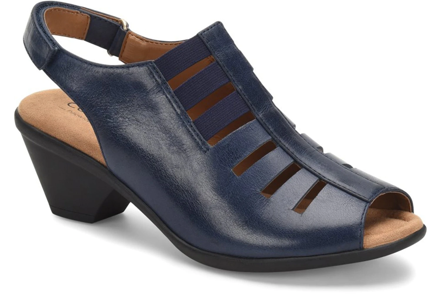 Comfortiva Faye is a strappy sandal built for comfort. Enjoy leather uppers, an adjustable slingback strap, flexible gore and memory foam cushioned footbed. Other features include a breathable synthetic lining, 2-inch heel height and a slip-resistant TPR outsole.