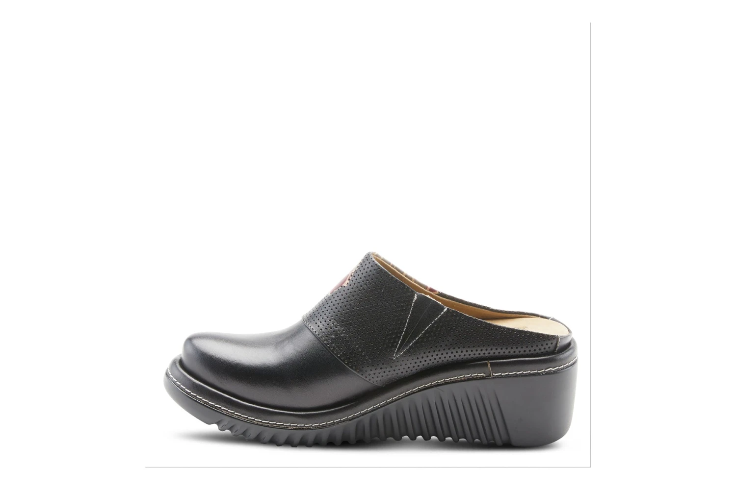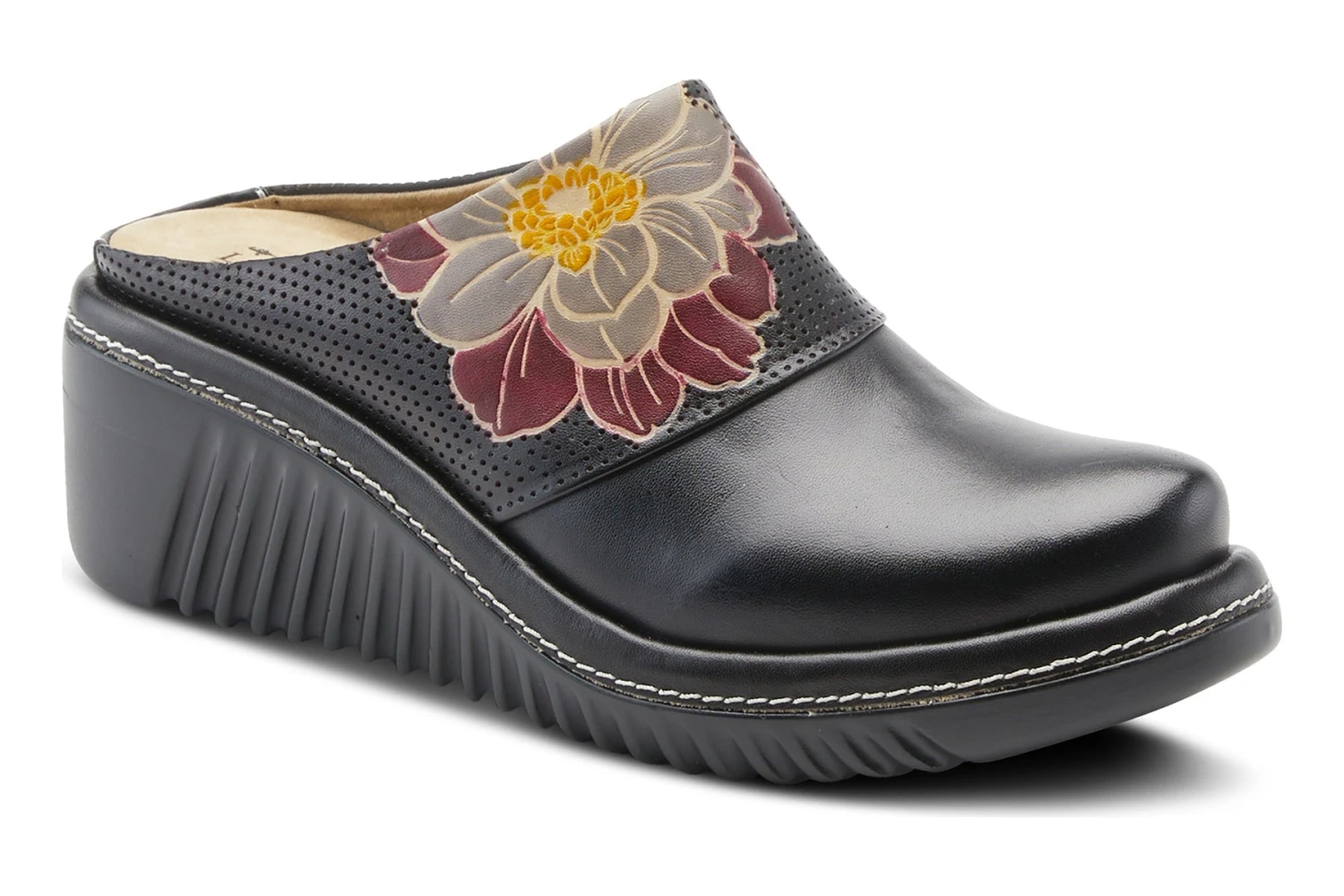 L`Artiste Style: Foresee -hand-painted, open-back, leather clog with embossed floral design and inside incorporate elastic for better fit on a lightweight wedge.