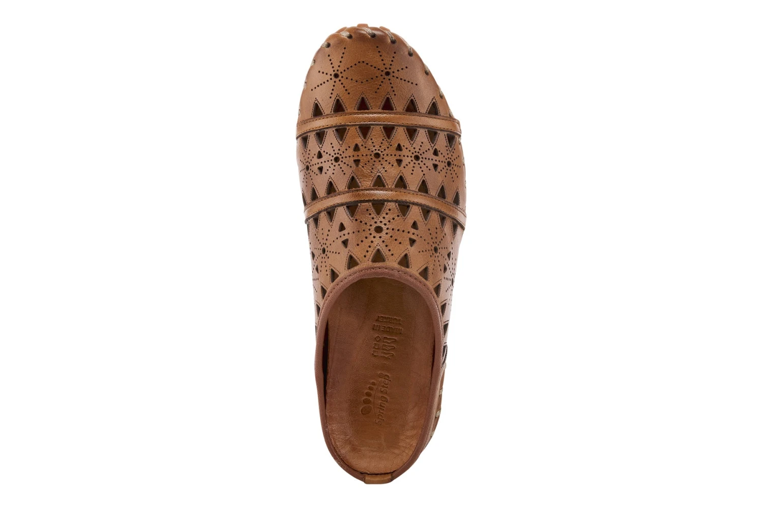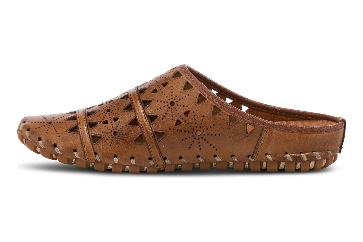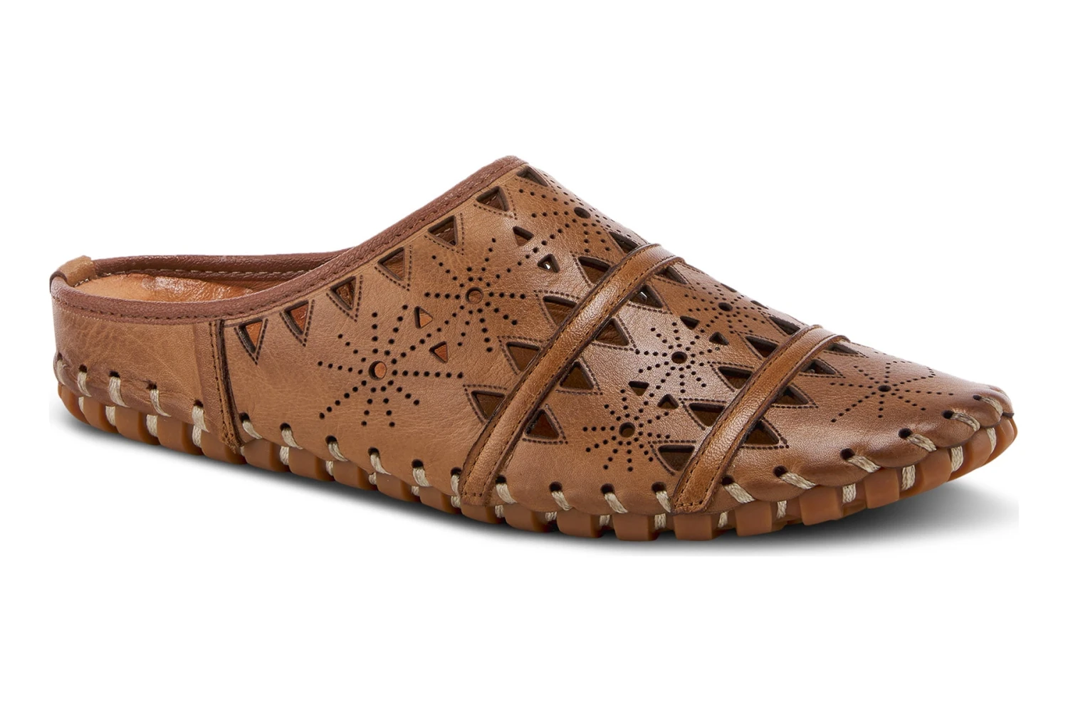 European-influenced, leather open-back slip-on shoe, featuring geometric laser cutouts and etching for a unique modern appeal all on a lightweight, durable, flexible, rubber sole for all-day comfort.