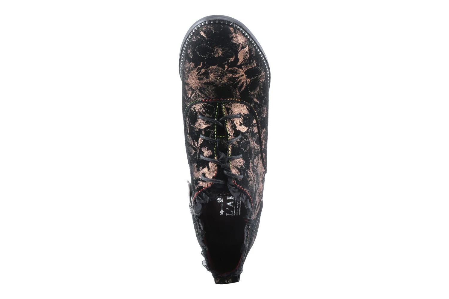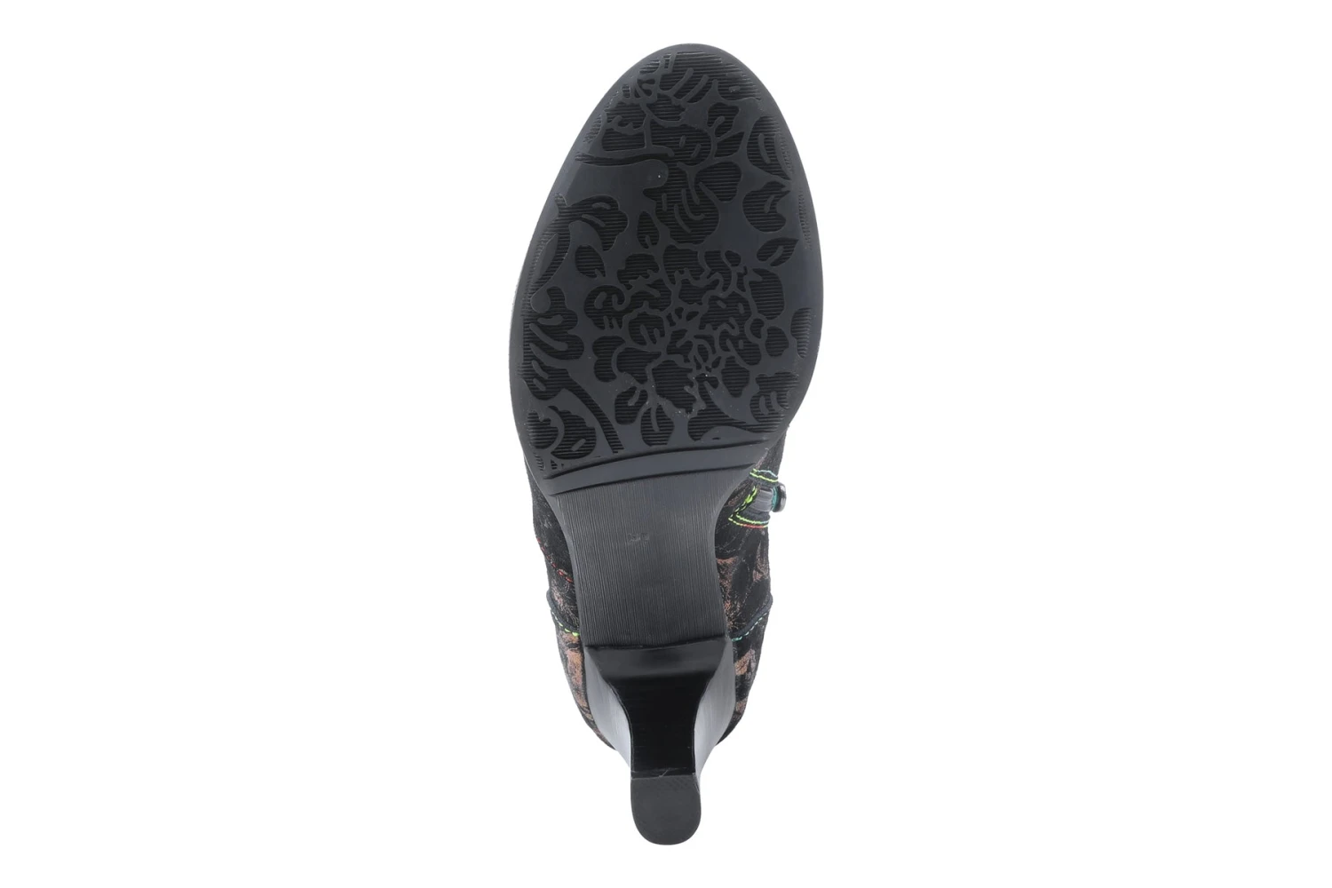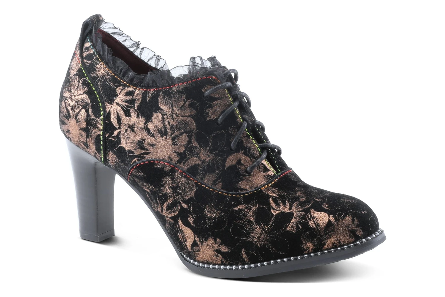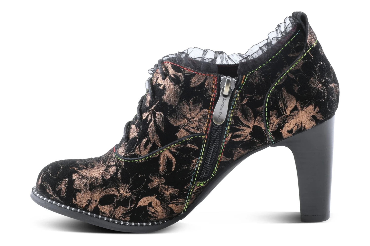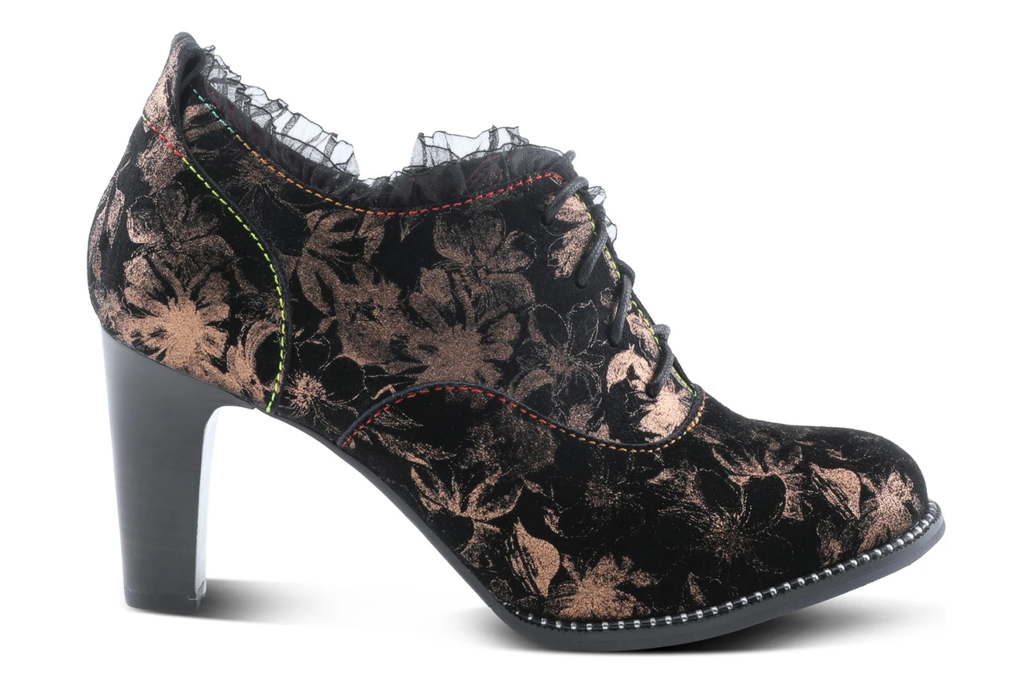 L`Artiste Style: Glitzish -Unique printed genuine suede shootie with feminine pleated tulle design, an inside zipper and Lace-up closure for adjustability and easy on and off on an elegant stacked heel, and bracelet inspired welt design.
