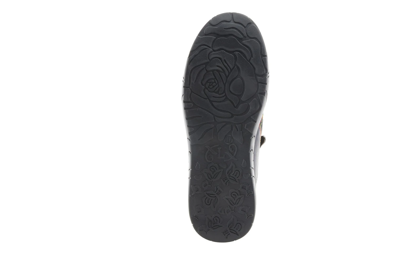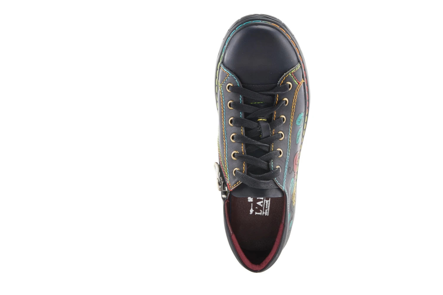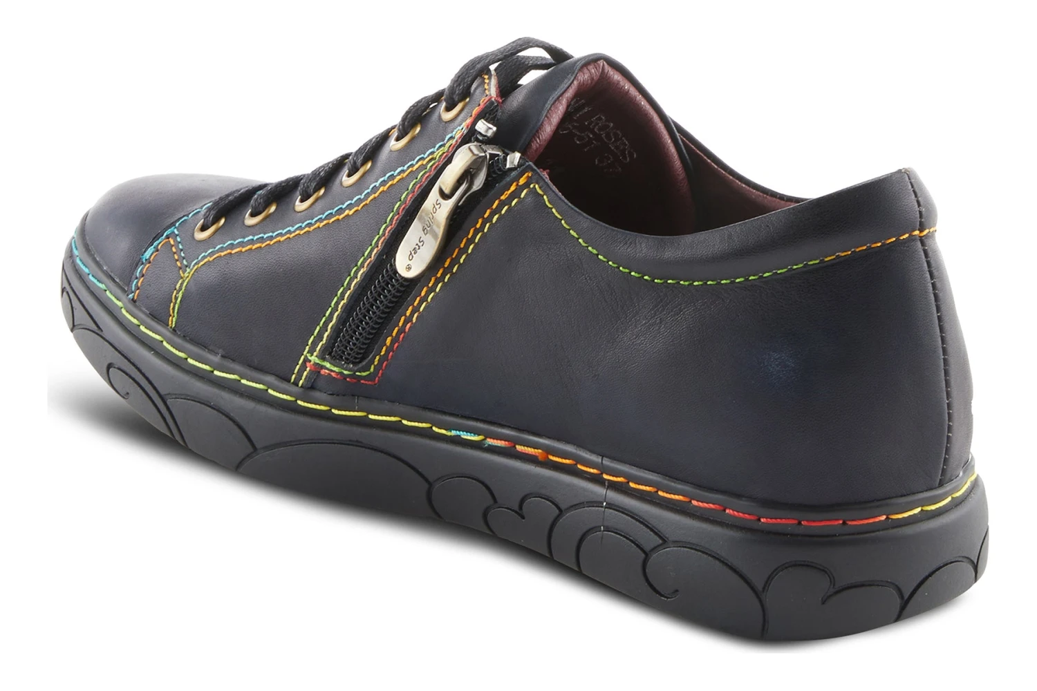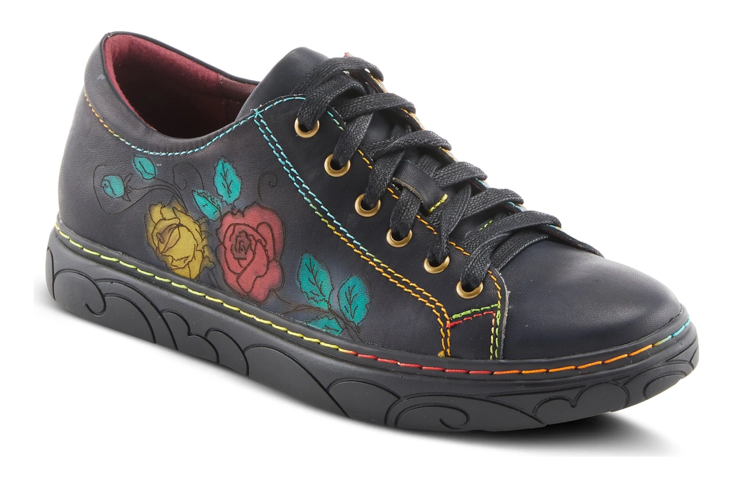 L`Artiste Style: Ilnad -French inspired zippered sneaker, featuring hand-painted leather with a beautiful rose detail on the outside, Lace-up closure with lace keeper, vibrant rainbow stitching, and a padded comfort collar and removable footbed all on flatform edged in rainbow stitching.