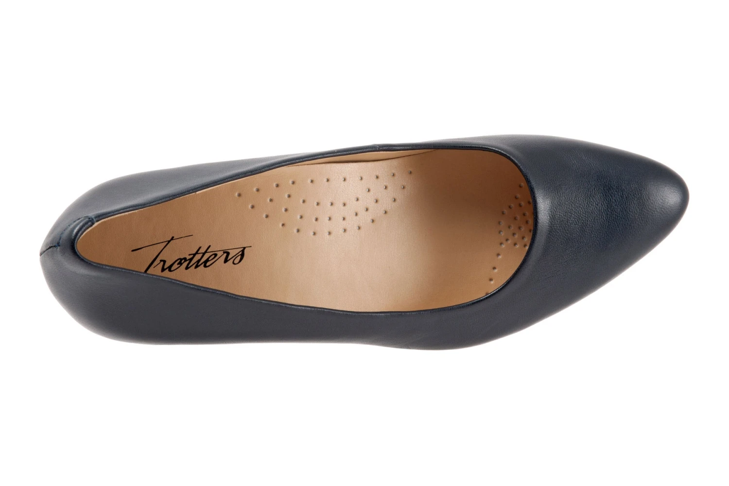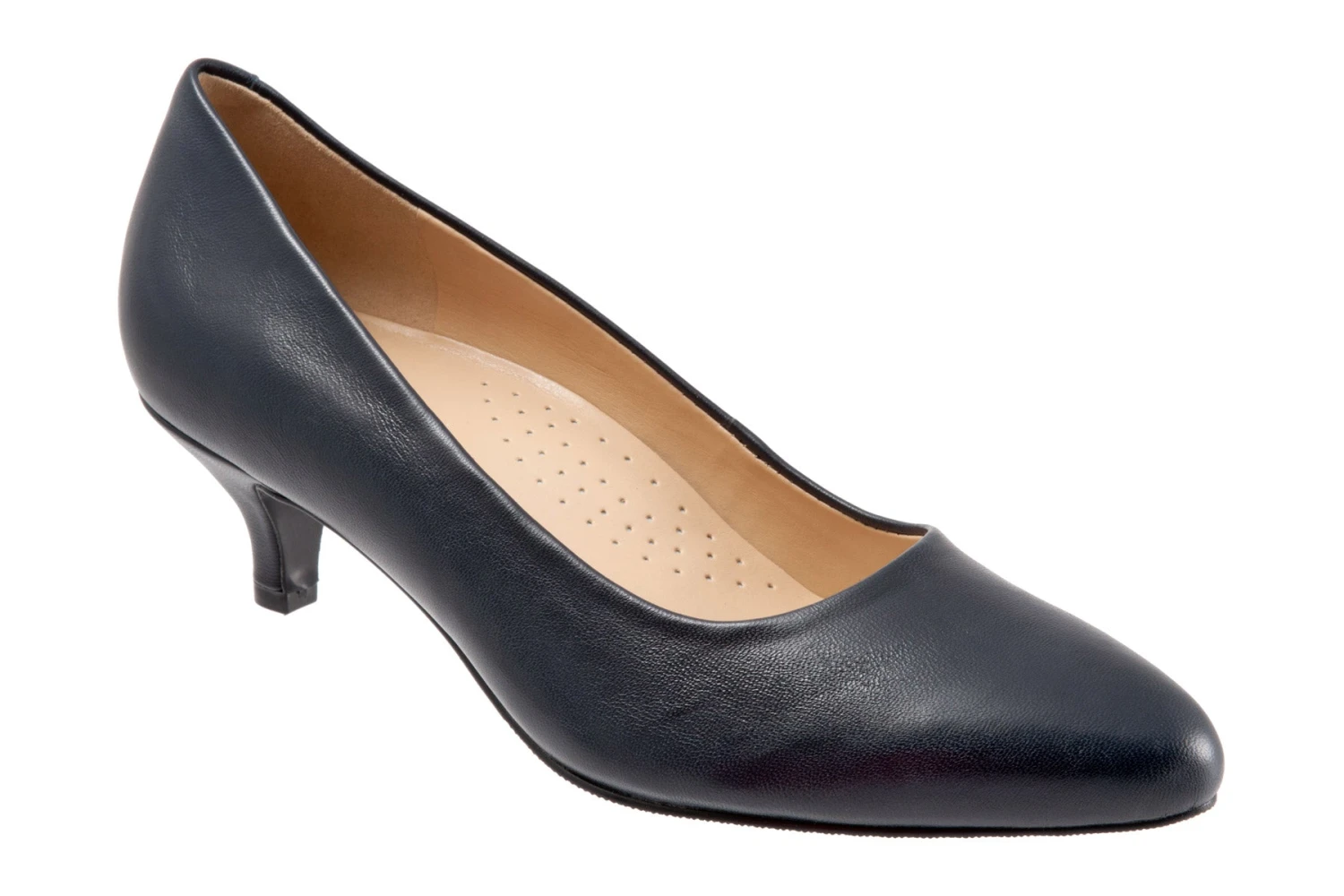 Trotters Kiera is an elegant and comfortable heel pump. Leather uppers, a removable memory foam footbed and a 2-inch heel height will make these a new favorite. Other features include a synthetic lining, pointed toe and a flexible rubberized outsole.