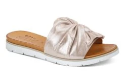 Flexible outsole, slip-on style with a beautiful leather twist bow. In a rainbow of colors, this is your go-to slide for the season. Small V-gore underneath the bow for additional adjustability. All parts of the foot touches the leather.