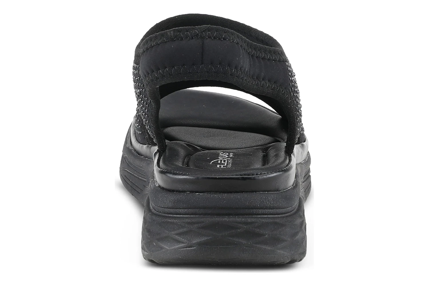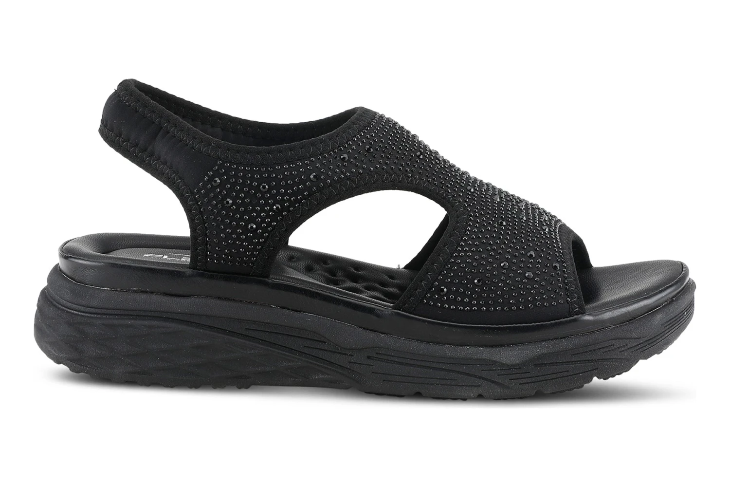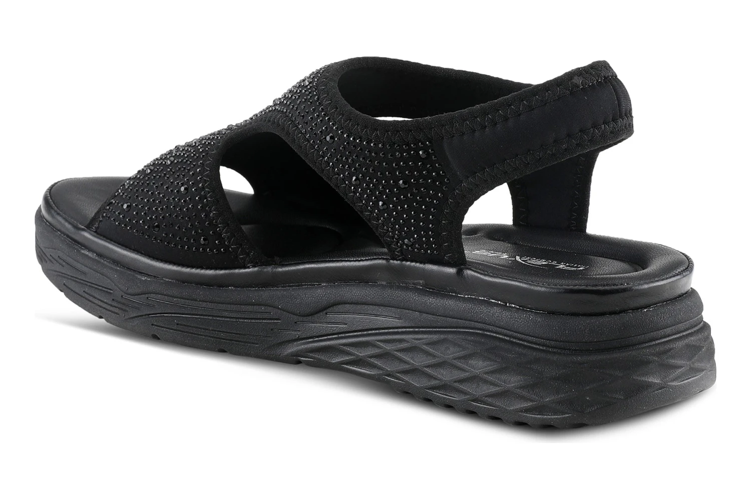 Sporty glitzy sling-back sandal with dainty crystals featuring a soft lycra stretch upper and backstrap that conforms to your foot for ultra-comfort all on a full-length padded footbed and durable sole.