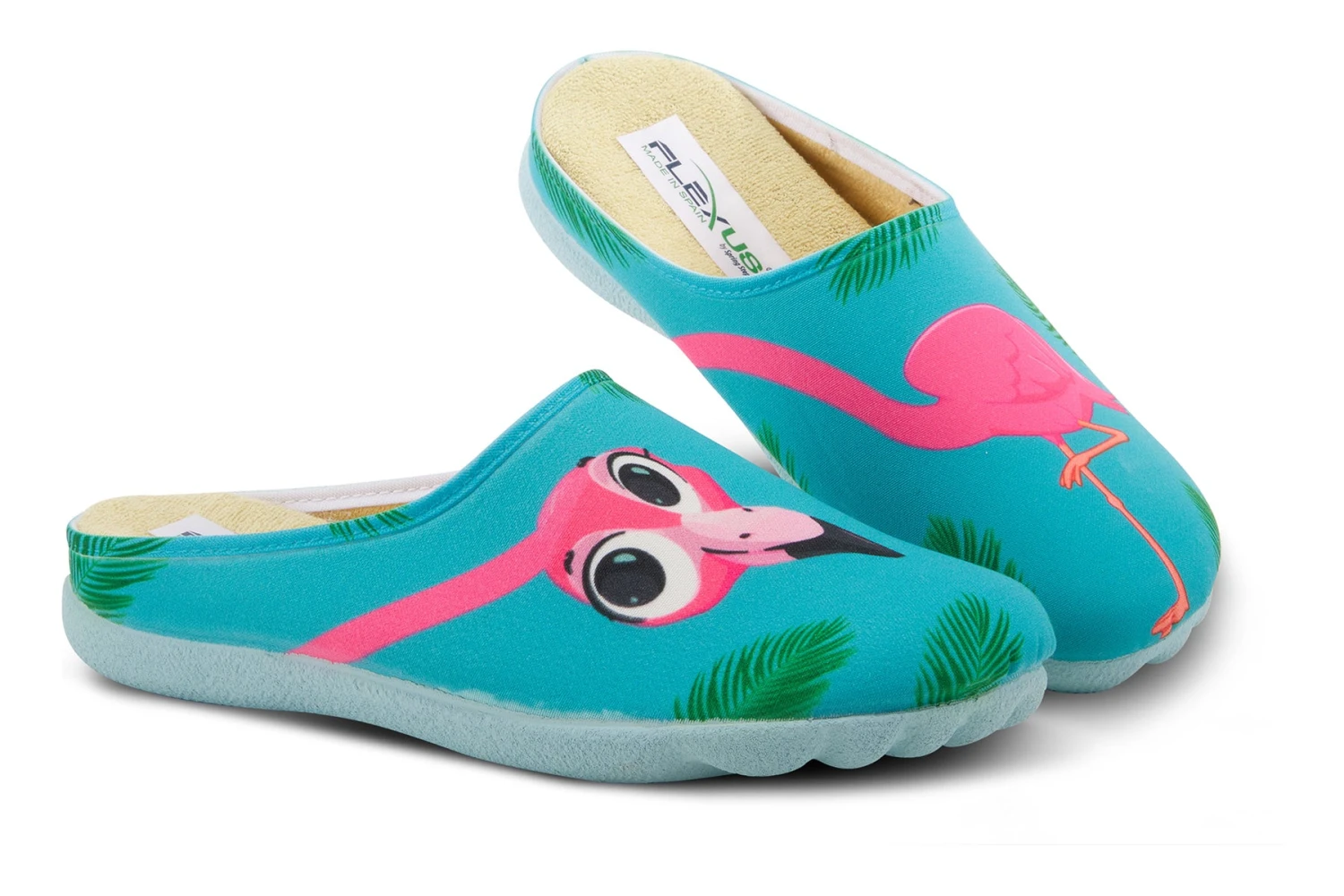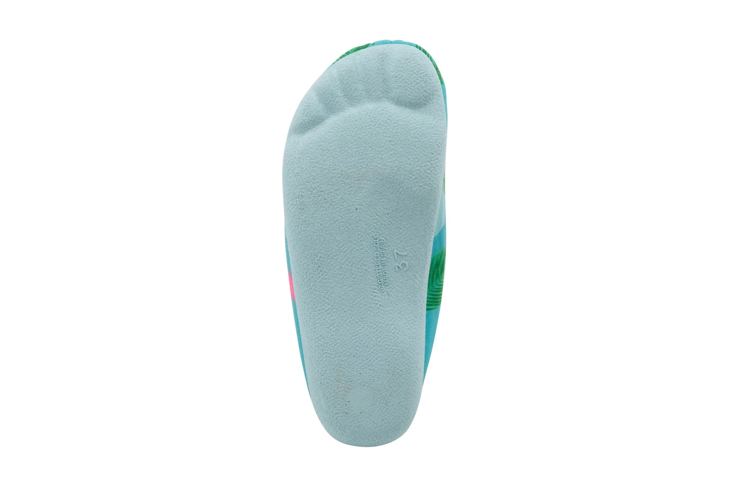 Whimsical and easy slip-on indoor/outdoor slipper featuring a vibrant print design on a contoured sole with the natural arch and indentation of a real foot and toes.