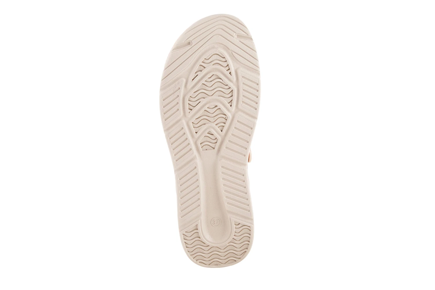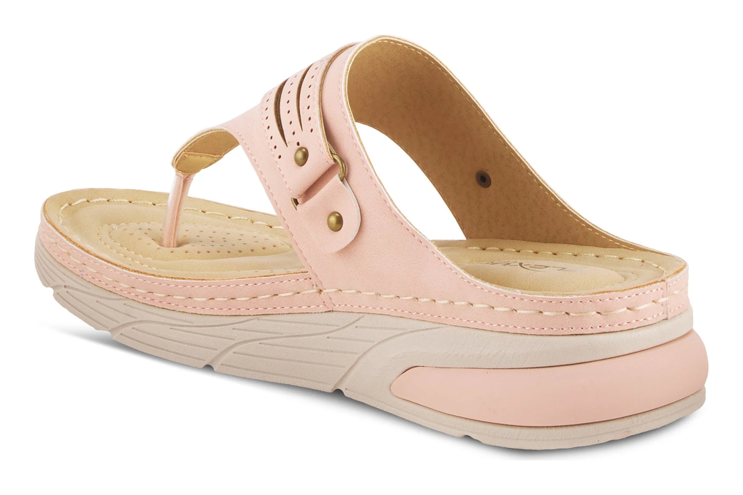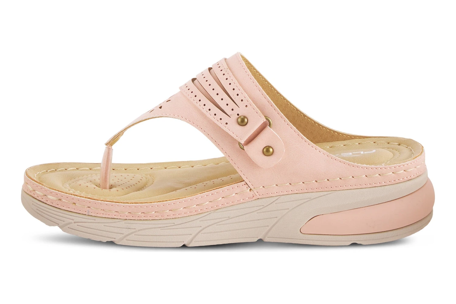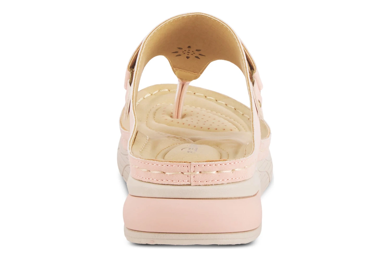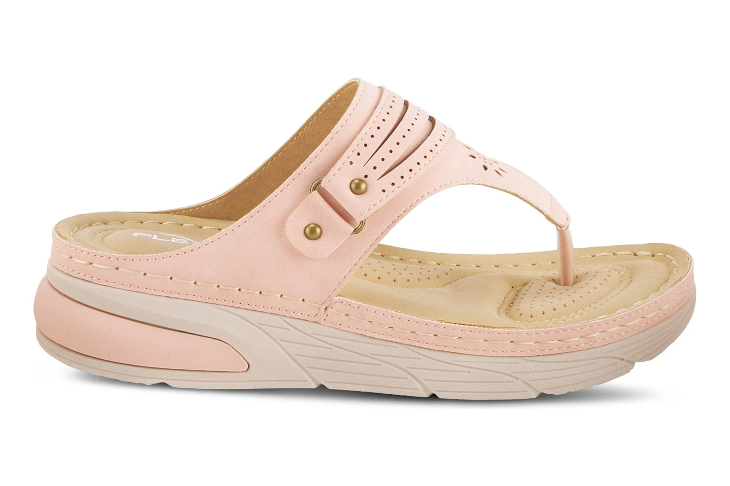 Stylish and sporty thong sandal with a floral perforation and embellishments on a cushioned insole and flexible outsole for everyday comfort.