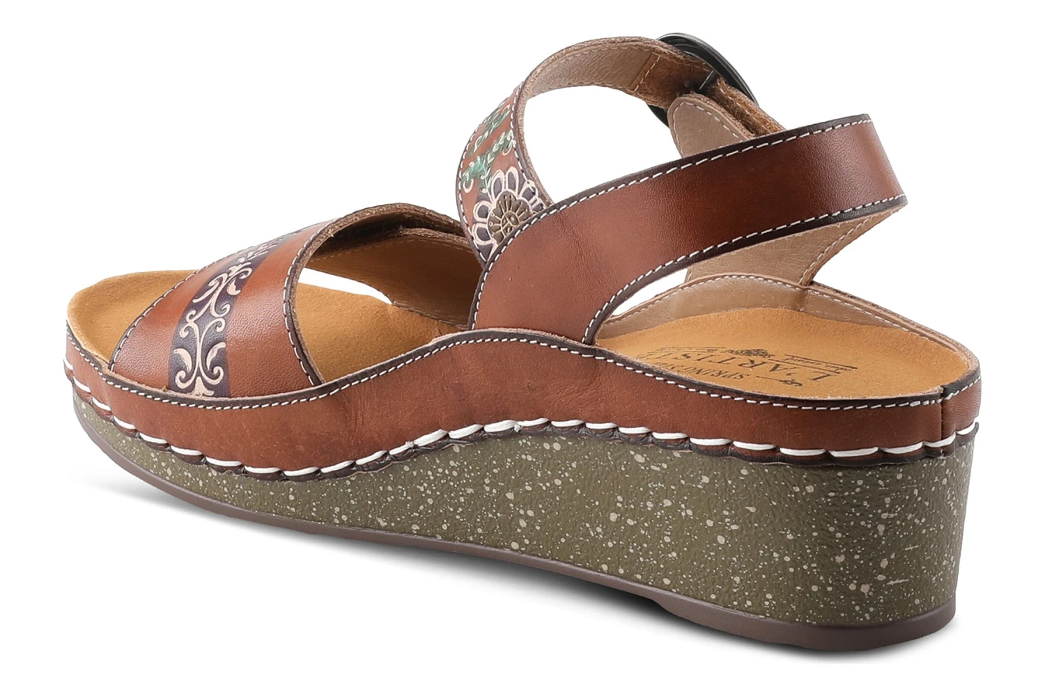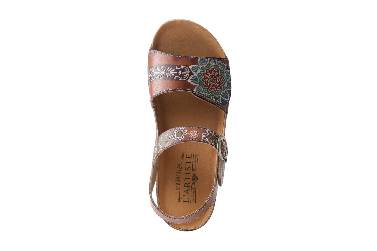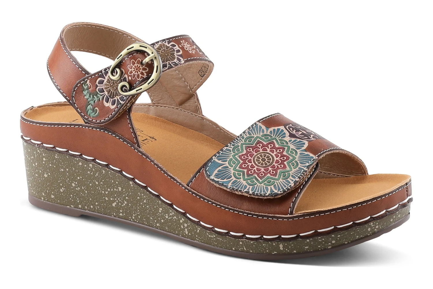 Hand-painted leather, multicolored abstract Sanskrit and floral designs, on this all-day comfortable fully padded cork-inspired wedge. Style, comfort, and beauty all in one. Double hook and loop adjustable straps with 1/4 strap antique brass lucky horseshoe embellishments.