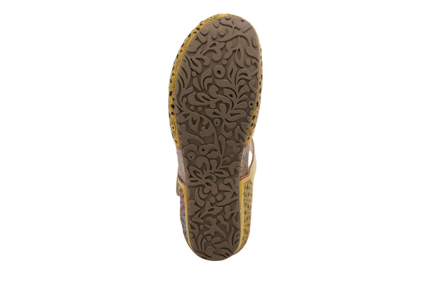 French-inspired, beautiful hand-painted premium leather clog featuring floral laser etching and cutout design, tonal stitchwork, and an adjustable hook and loop instep strap with an antiqued brushed metal ornament all on a cork and latex-wrapped, comfort wedge with a platform.