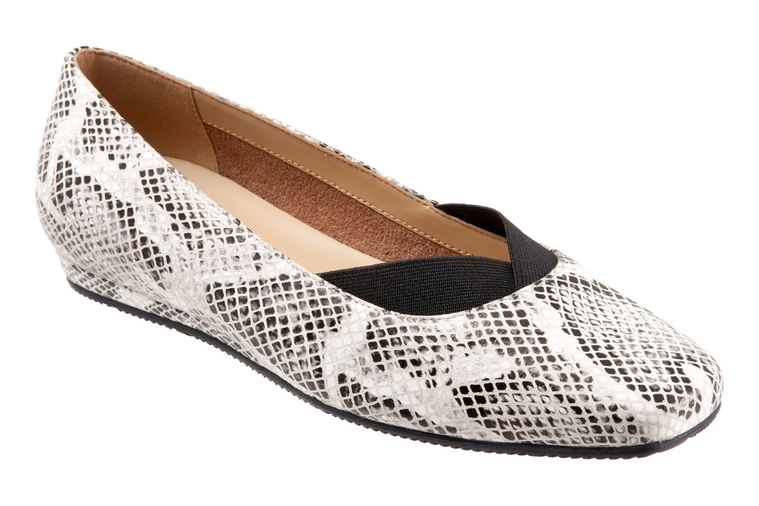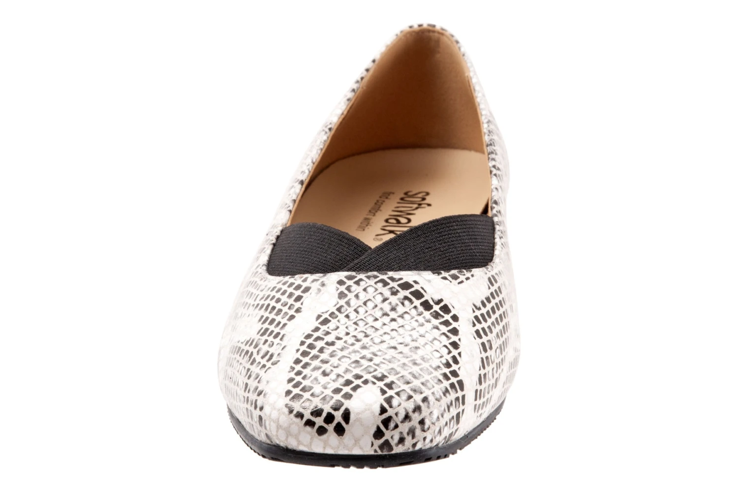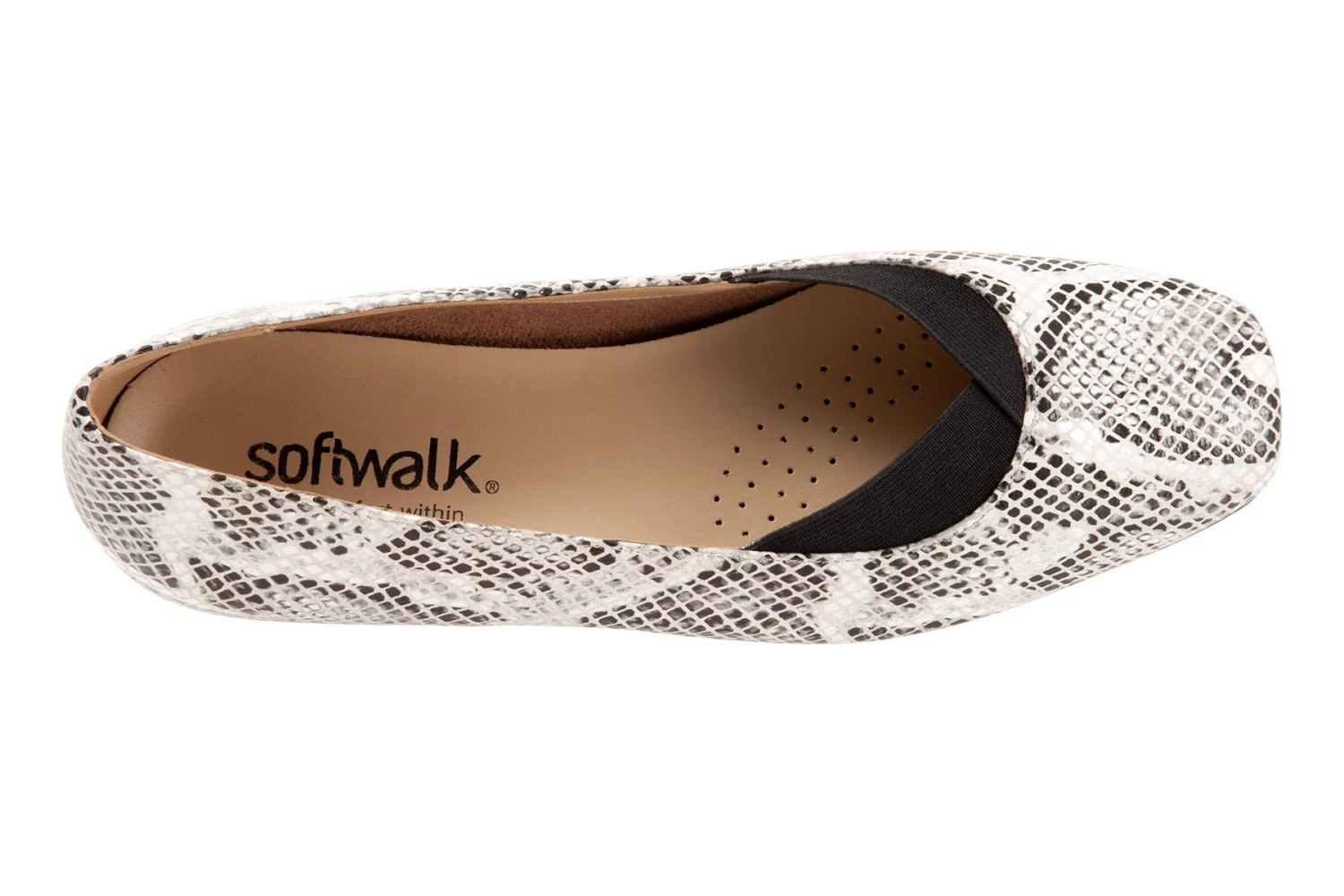 Softwalk Viana is a comfortable square-toe flat. A leather upper, removable footbed, cushioned footbed and flexible rubber outsole outlines these elegant flats. Other features include a microfiber upper lining, elastic goring and a lined and cushioned insole.