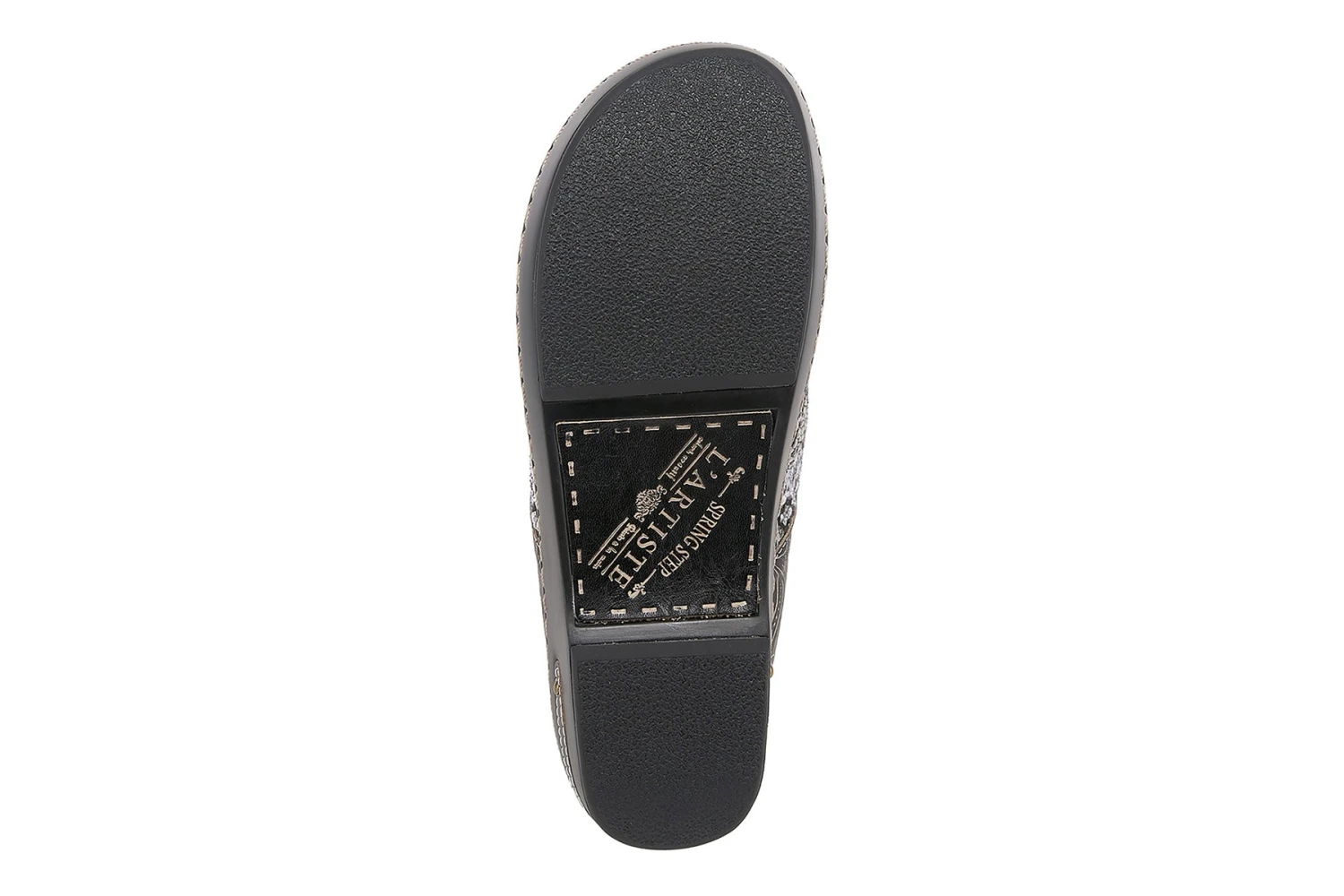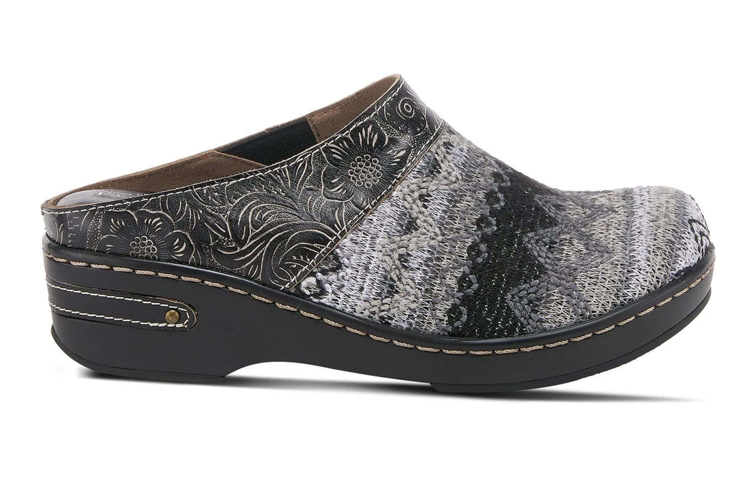 L`Artiste ZIGINO Fashionable backless leather combo clog with gorgeous woven textile and debossed floral leather on an incredibly comfortable outsole.